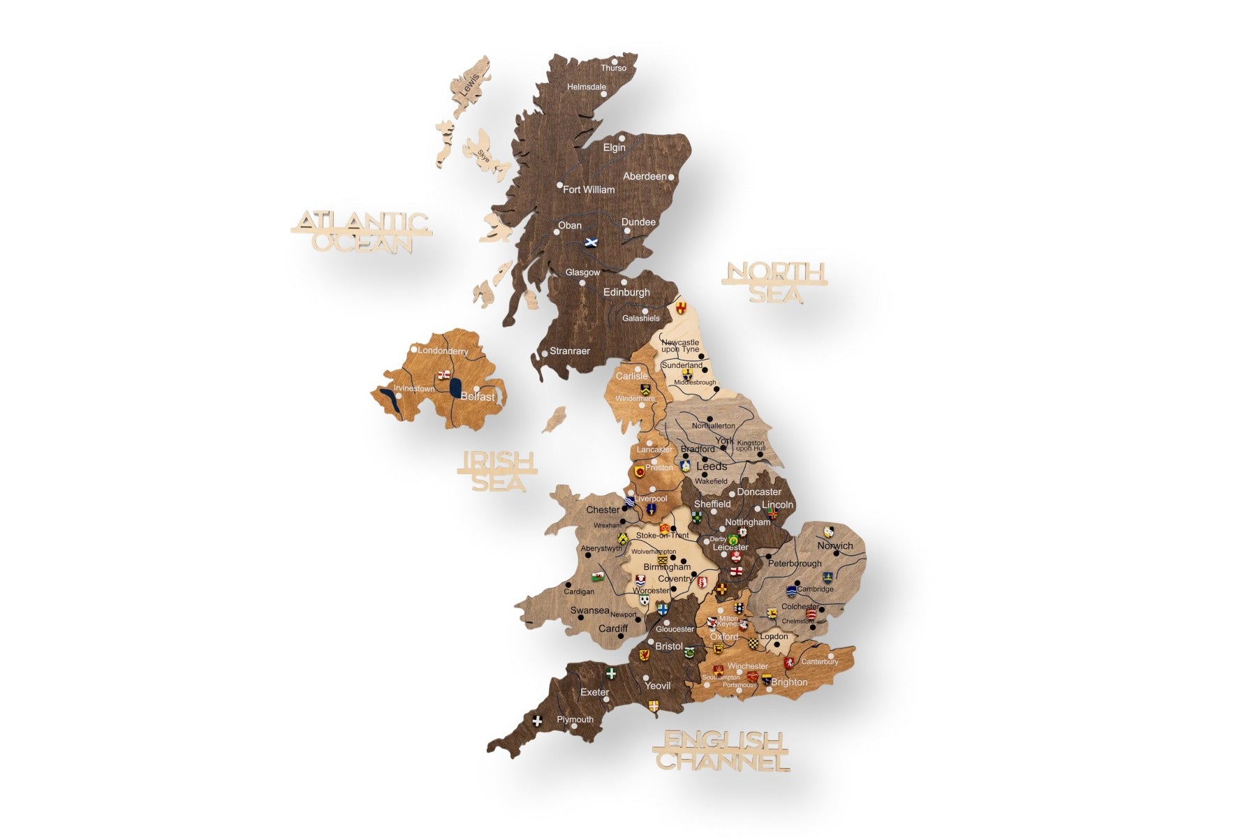 Este mapa del Reino Unido con ciudades está construido mediante un diseño apilado e intrincado donde los elementos se superponen para dar profundidad dinámica al mapa. El acabado multicolor resalta bellamente los diferentes países dentro del Reino Unido, creando una exhibición vibrante y educativa. El mapa delimita claramente los países individuales y sus fronteras, sirviendo como un completo mapa de los países del Reino Unido.